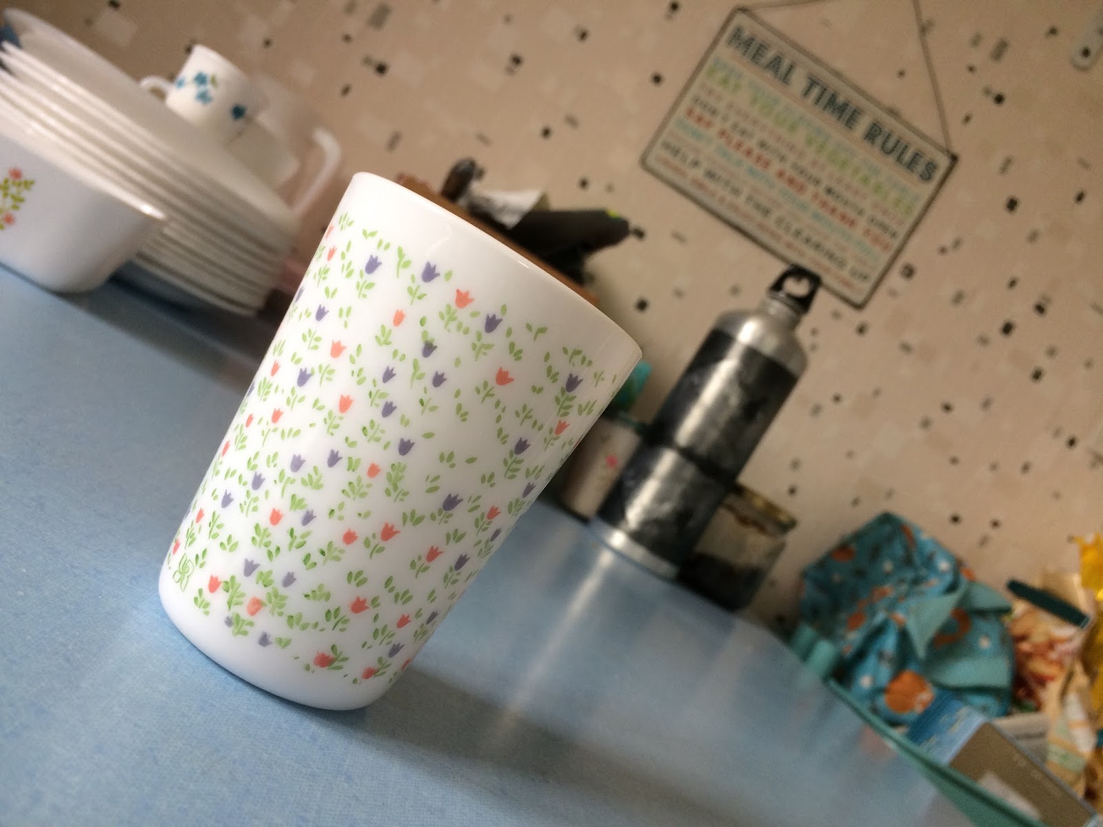 Il y a aussi ce gobelet et sa petit soucoupe haute que j’ai chinés en foire à tout. Je n’ai jamais trouvé ce décor ailleurs. Toute info sera la bienvenue. Mais ce petit semis Liberty me le fait mettre dans ma collection seventies. Sans doute un verre et une soucoupe pour petit enfant.