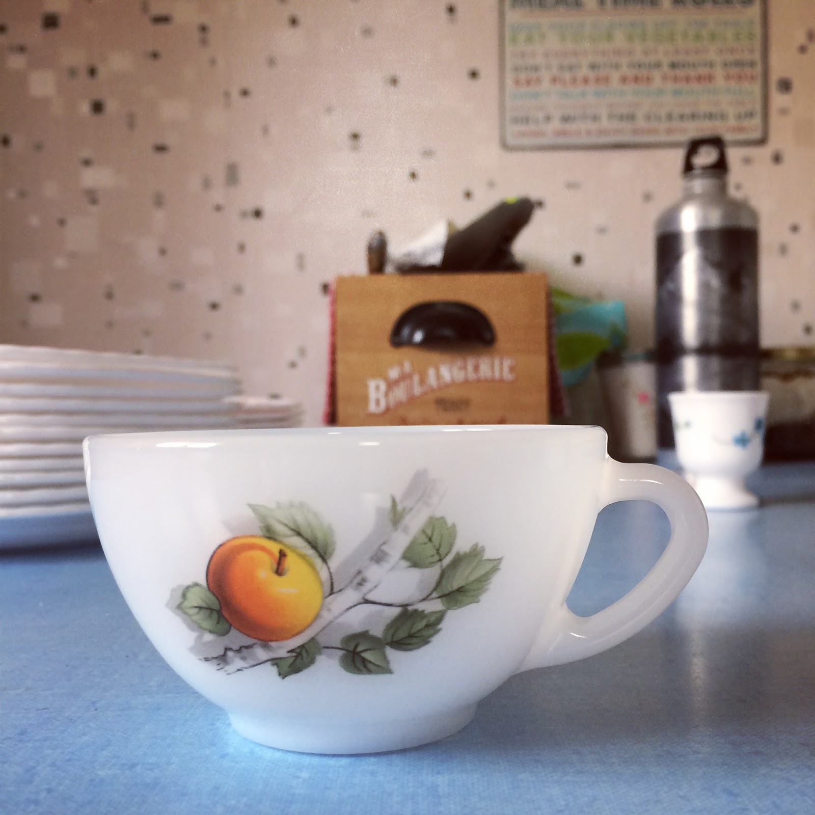 Dégotées aussi ces tasses à café (sans les soucoupes!) avec motif de pommes et branche de pommier des années 60. La dame à qui je demandais le prix me dit « 3 €? ». Moi : « Il y en a combien? ». Elle: « Aucune idée ». On les a comptées avec mon fils Etienne, de retour à la maison : 28 !